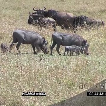 Warthog Family and a large Blue Wildebeest herd grazing on savannah grassland AmCam
