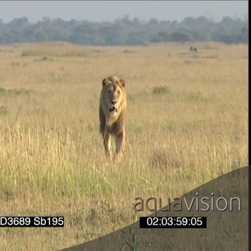 African male lion patrolling towards past camera scouting around hunting