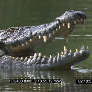 Crocodiles in pond; waterhole, laying, opening mouth XCU; FF; CU