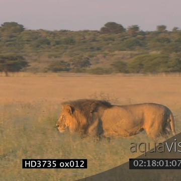 Male lion patrolling territory on Kalahari grassland at sunset, looking for prey or intruder, walk across out of frame MS