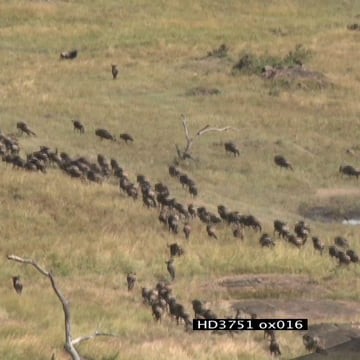 AERIAL Blue Wildebeest herd running migrating on the Serengeti savannah HA XWS WS