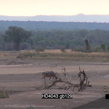 Hippo walking across semi-dry Luangwa riverbed Windy light drizzling rain