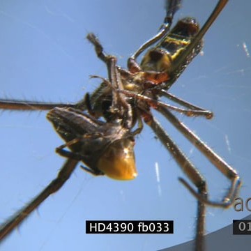 Golden orb web spider feeding on a cricket CU FOCUS PULL