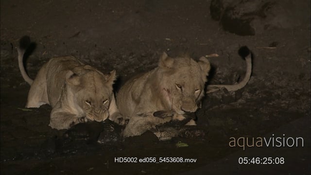 African Lion’s strangle feeding on impala stuck in the mud at NIGHT