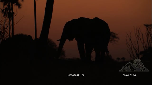 Scenic shot of palm trees in grassland, Africa Elephant elephant in silhouette at dusk.