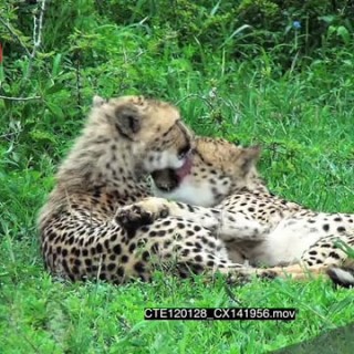 Cheetah cubs sit with female, lay down, cubs groom cheetah, show affection MWS; FF