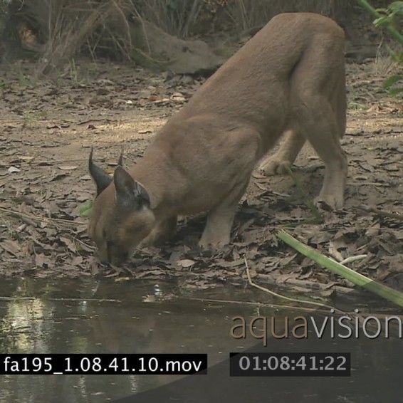 Caracal standing sniffing a waterhole and a tortise next to the waterhole FF