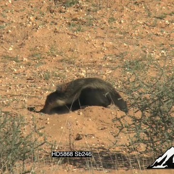 A honey badger walking around and digging with a Pale Chanting Goshawk walking around and standing GENERAL BEHAVIOUR
