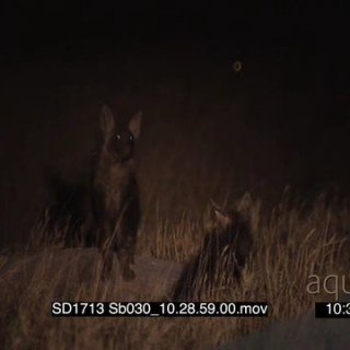 Juvenile Brown hyenas walking around foraging tall dry grass at den sniffing each other social interaction at NIGHT