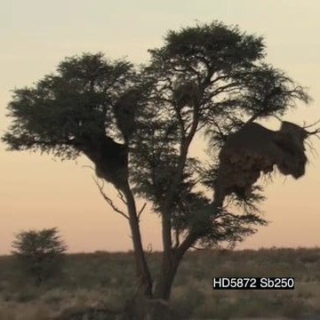 Sociable weavers flying around in out of nest zoom out from tree nest to Scenic Kgalagadi Transfrontier Park Bushveld