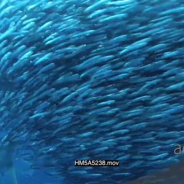 School of Blacktip Sharks with Cape Gannets swimming hunting and attacking Sardine bait ball underwater in ocean MWS PAN HAND
