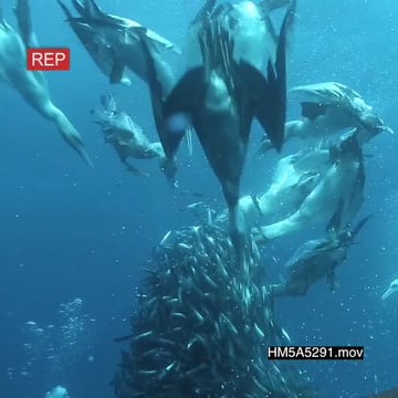 Swimming down Cape Gannets feeding on Sardine bait ball, joined by Blacktip Sharks and Skipjack Tuna UW