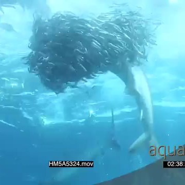 Cape Gannets with Dusky Sharks and Blacktip Sharks attacking and feeding on Sardines swimming in a ball underwater in ocean LA WS HAND