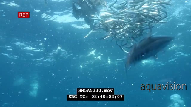 Divers filming Cape Gannet flock attacking and feeding on Sardine ball swimming underwater in ocean