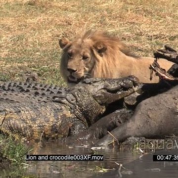 Male lion next to Nile Crocodiles [3] feeding on a buffalo carcass MS 2 Shot