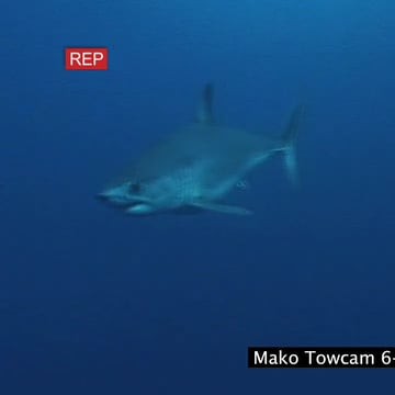 Mako Shark swimming underwater in ocean following camera then turning back MWS TRAVELING SHOT