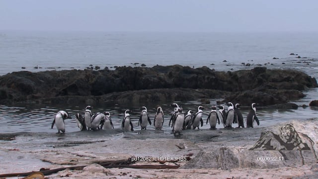 African Penguin colony standing, shaking, preening themselves and looking around. Misty during dawn.