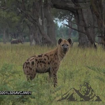 Spotted Hyena Standing looking at the camera and walks away PAN Across to another Hyena Sitting down looking around the Savannah with Elephants and Zebras grazing in the Background