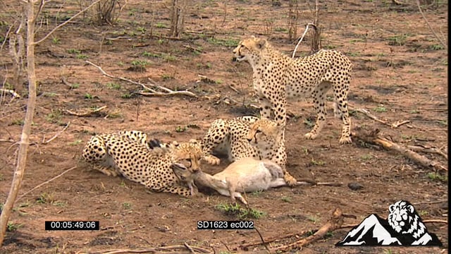 Leopard chases three [3] Cheetah off their kill but gets chase into a tree by Lion Pride.