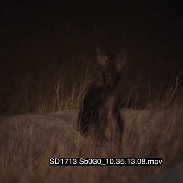 Juvenile Brown hyena grooming outside den entrance at NIGHT
