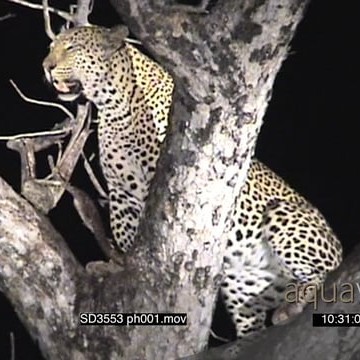 Leopard with its kill in tree, Lioness climb up and try to take kill away from Leopard NIGHT