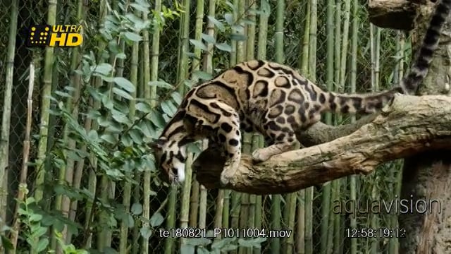 Clouded Leopard crouching on a tree branch while hunting, walking backwards and climbing down trying to to locate the prey. [To highlight Animal Captivity]