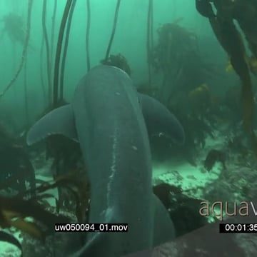 Sevengill cow shark swimming through kelp forest underwater in ocean passing by and bumping camera MLS MS CU PAN HAND