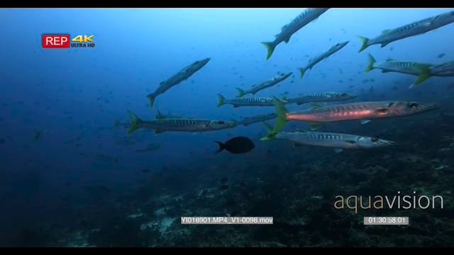 close up, slow motion shot of a school of blackfin barracuda fish sphyraena qenie passing in front of the camera