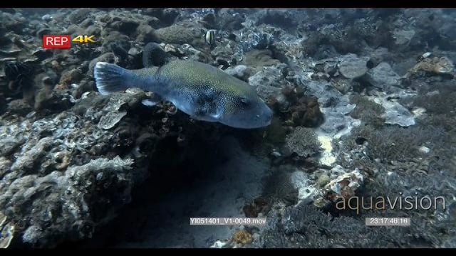 CU slow motion shot of a blue-spotted pufferfish swimming above the reef