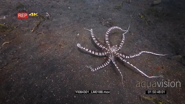 Close up tracking shot of a mimic octopus, octopus sp19, Thaumoctopus mimicus swims in the sea above the sand