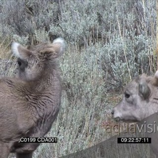 Bighorn sheep cub standing and looking around and one grazing MS