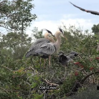 A family of Great blue heron on a tree will the mother feeding the young and the male moving from one branch to the other WS