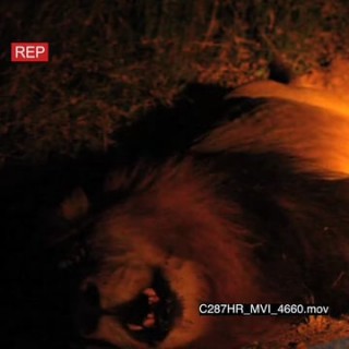 Lion male laying on its side roaring at camera at night MCU