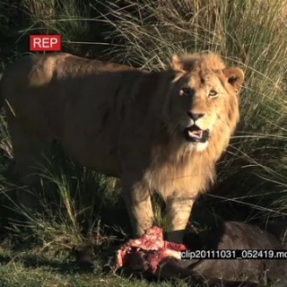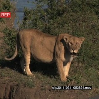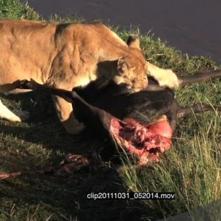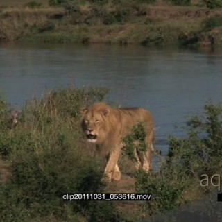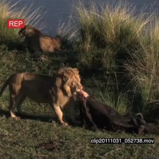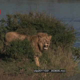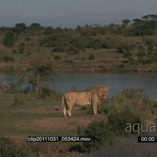 Select options DownloadAfrican Lion standing near a kill on riverbank looking around then walking away and Lioness laying down HA LS ZI MS