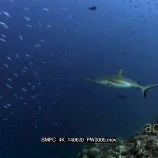 Two Gray Reef Sharks, Carcharhinus amblyrhynchos swim through a school of fish. One shark has two Pilot fish ,Naucrates ductor, attatched to its nose.