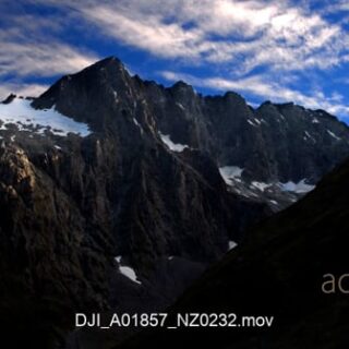 Aerial shot rugged mountains capped with snow while wispy clouds pass by at the Fiordland district.
