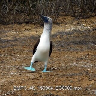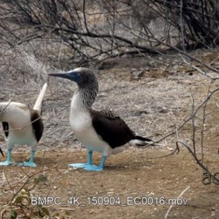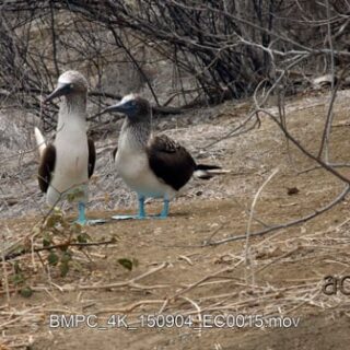 MS shot of two blue booby’s standing, looking around and towards the camera.