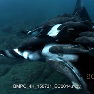 WS of a giant Manta ray that is heavily laden with Remora’s glides in the sea.