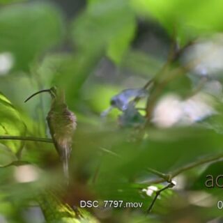 Long-billed Hermit (Phaethornis longirostris) communicating and preening between green leaves.
