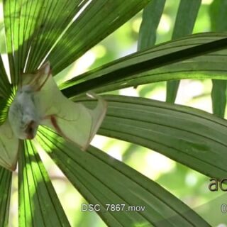 Northern Ghost bat (Diclidurus albus ) hanging under palm leaves and spreading wings.
