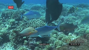 Humphead Wrasse with Estuary Perches and Bluefin Kingfishes swimming on coral reef underwater in ocean MWS PAN HAND