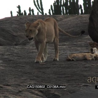 African Lioness laying down on a large rock with cubs then standing MLS PAN HAND
