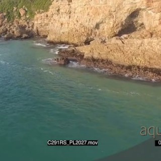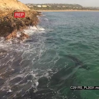 Great white shark hunting patrolling along coastline AERIAL TRACKING GOOD LIGHT