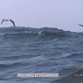 Cape gannets flying over ocean tilt down Cape fur seals playing swimming in water
