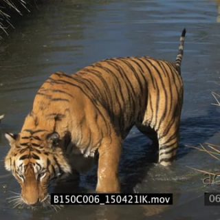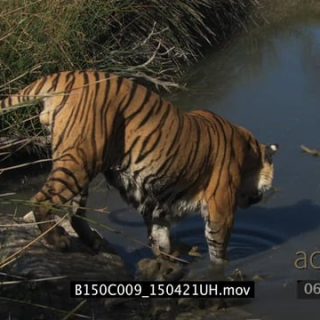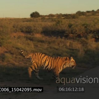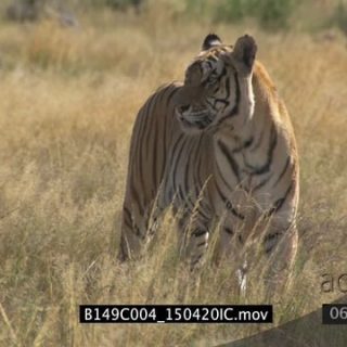 Bengal Tiger patrolling and scouting around in dry tall savannah grassland WS PAN