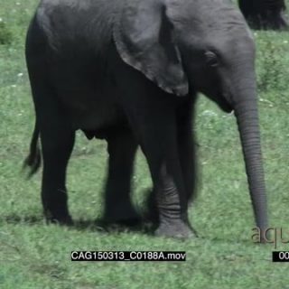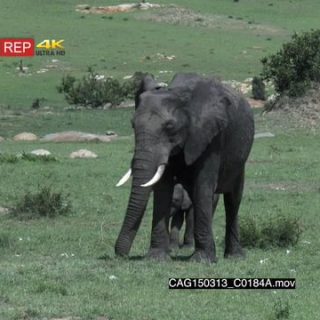 African Elephant walking and grazing on grassland with calf LWS PAN HAND