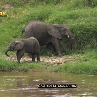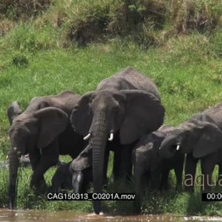 African Elephant with calves standing on riverbank moving and grazing MWS HAND