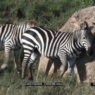 A Small Dazzle of Zebra herd standing on bushveld moving and Scratching themselves against a rock MWS HAND
