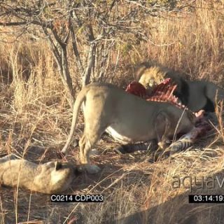 Lion pride with cubs, Male Lion feeding on Zebra carcass Cubs playing on the side