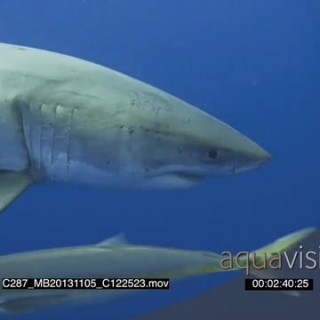 Great White Shark approaching, swimming in Deep blue ocean AmCam UW